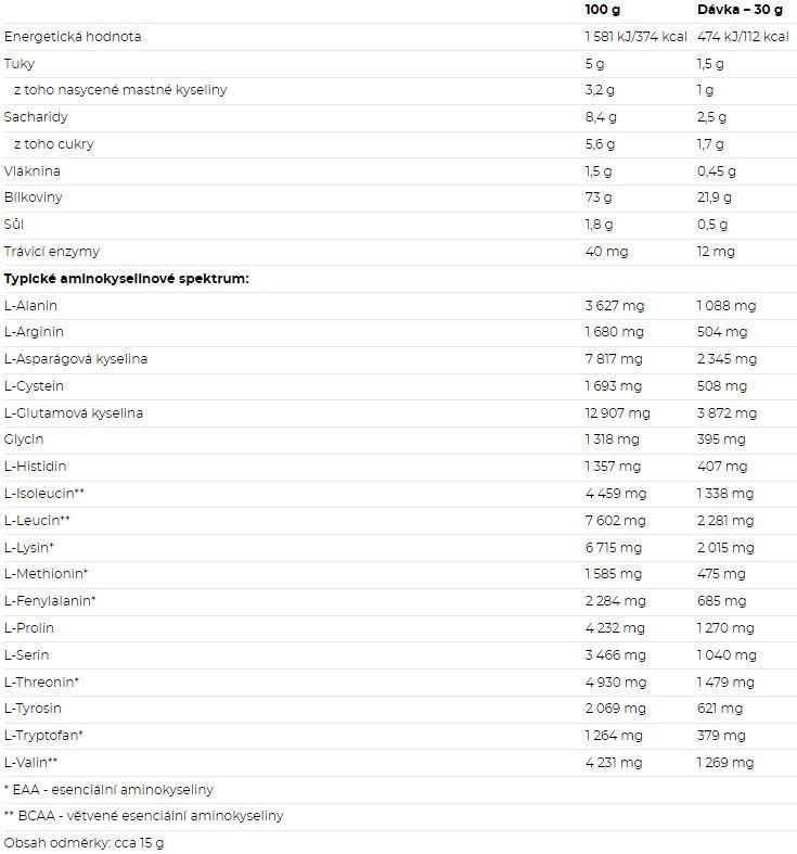 80% srvátkový proteínový koncentrát (obsahuje slnečnicový lecitín a protispekavú látku fosforečnan vápenatý), 13,5% srvátkový proteínový izolát (obsahuje slnečnicový lecitín), aróma, oxid kremičitý, chlorid sodný, zmes tráviacich enzýmov Digezyme® (amyláza, proteáza, laktáza, lipáza a celuláza), sladidlá sukralóza a steviol-glykozidy. Môže obsahovať stopy sóje Príchuť: mango & vanilka