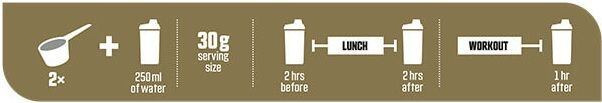 80% srvátkový proteínový koncentrát (obsahuje slnečnicový lecitín a protispekavú látku fosforečnan vápenatý), 14,5% srvátkový proteínový izolát (obsahuje slnečnicový lecitín), aróma, , chlorid sodný, zmes tráviacich enzýmov Digezyme® (amyláza, proteáza, laktáza, lipáza a celuláza), sladidlá sukralóza a steviol-glykozidy. Môže obsahovať stopy sóje. Príchuť: čokoládové brownies