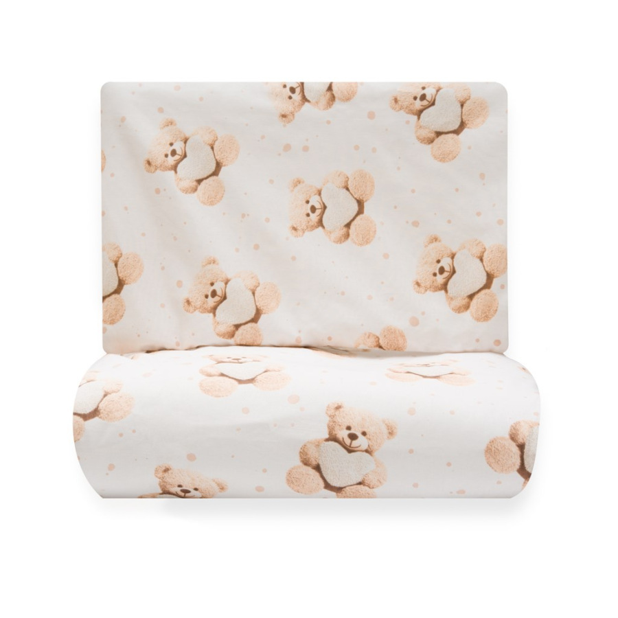 Detská 2-dielna súprava do postieľky New Baby Love Teddy Bear. Súprava je vyrobená zo 100% bavlny. Kvalitné prevedenie a nádherný detský motív. Obsahuje obliečky na vankúšik cca 40x60 cm + obliečky na perinku cca 120x90 cm. Materiál 100% bavlna.