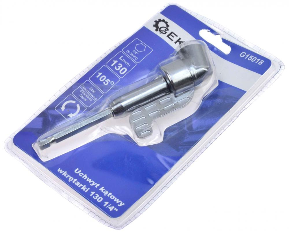 Skrutkovač alebo vŕtací nástavec umožňuje skrutkovanie a vŕtanie pod uhlom a na ťažko prístupných miestach. Plochá rukoväť môže byť nastavená v ľubovoľnom uhle, aby sa zaistilo pevné uchopenie. Dĺžka 13,5 cm, 1/4" šesťhranná stopka.