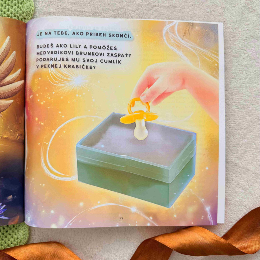 Jedna myška, jeden cumlík a jedno veľké rozhodnutie! Myška Lily má svoj cumlík najradšej na svete – je s ňou všade: v lese, na návšteve u starkej aj večer v postieľke. Keď sa však dozvie, že malý medvedík Brunko stratil svoj cumlík a nedokáže zaspať, čaká ju výzva: dokáže sa vzdať svojho milovaného cumlíka, aby mu pomohla? Citlivý príbeh povzbudzuje deti k odvahe, spolupatričnosti a ochote podeliť sa. Súčasťou knihy je krabička na vystrihnutie, do ktorej môže dieťa po dočítaní príbehu vložiť svoj vlastný cumlík – presne ako Lily.