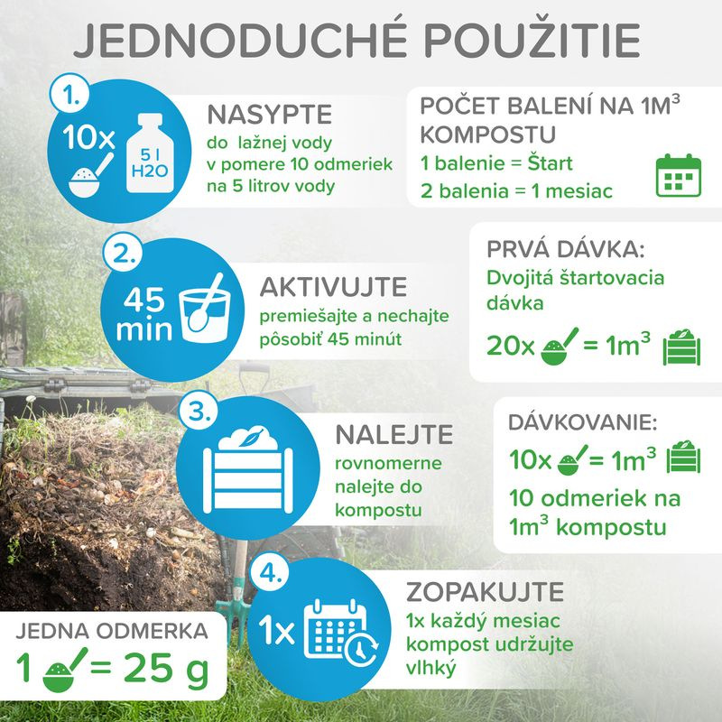 - Urýchľuje zrenie kompostu až o 3 mesiace.