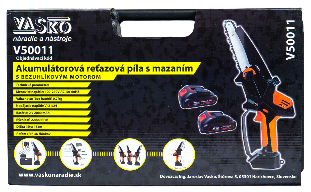 Akumulátorová reťazová píla s mazaním, lišta 15 cm, 2x bat. 2Ah 21V, 1x nabíjačka, VASKO