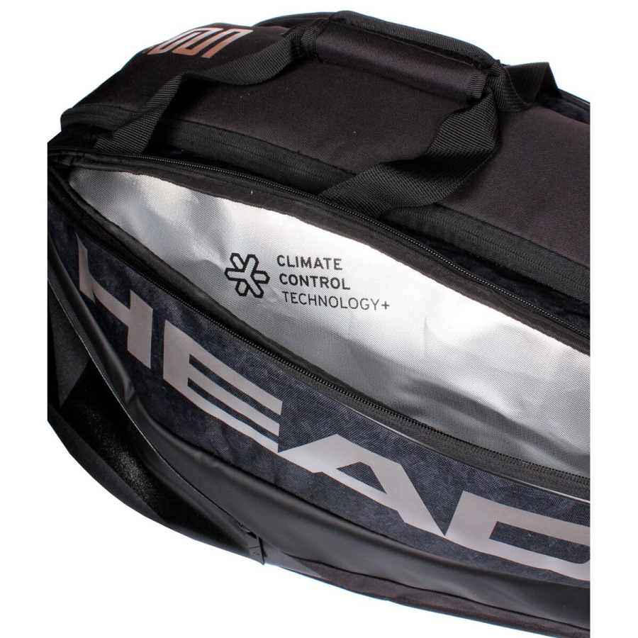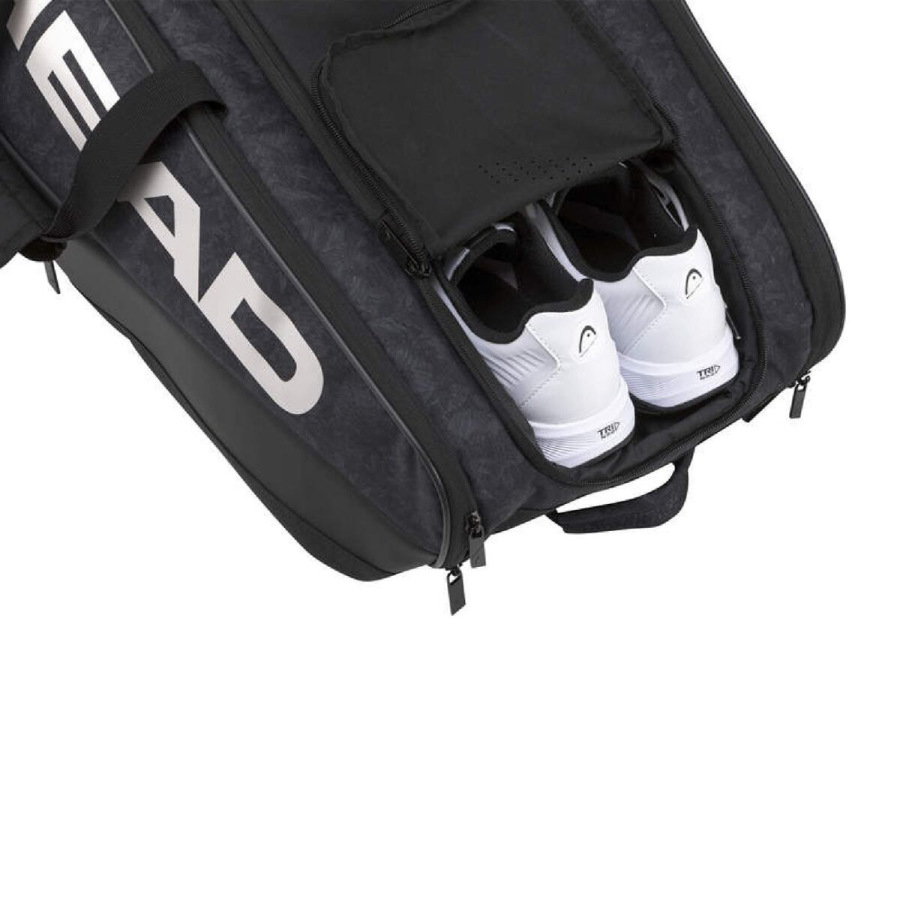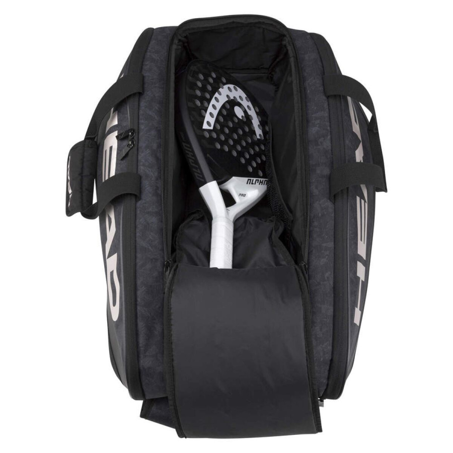 Padelová taška HEAD Alpha Sanyo Monstercombi je moderná taška pre hráčov všetkých výkonnostných úrovní. Tento padel bag s prémiovým dizajnom ponúka množstvo priestoru pre kompletné vybavenie na kurt. Taška má okrem hlavnej priehradky ešte dve bočné vrecká pre rakety, pričom jedno z nich má technológiu CCT+, ktorá chráni vaše rakety pred extrémnymi teplotami. Ďalej taška ponúka samostatné odvetrávané vrecko na topánky a dve malé bočné vrecká na zips vhodné pre drobnosti. Tašku je možné pohodlne prenášať na chrbte ako batoh vďaka dvom nastaviteľným polstrovaným popruhom. - Objem: 45 l