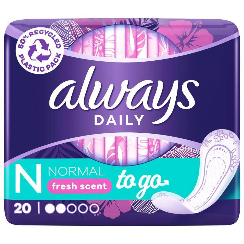 Always Daily Normal To Go fresh scent sú tenké slipové vložky s jemnou vôňou, ideálne na každodenné použitie a na cestovanie. Poskytujú spoľahlivú ochranu a pocit čistoty počas celého dňa. Balenie obsahuje 20 kusov.