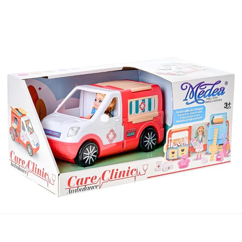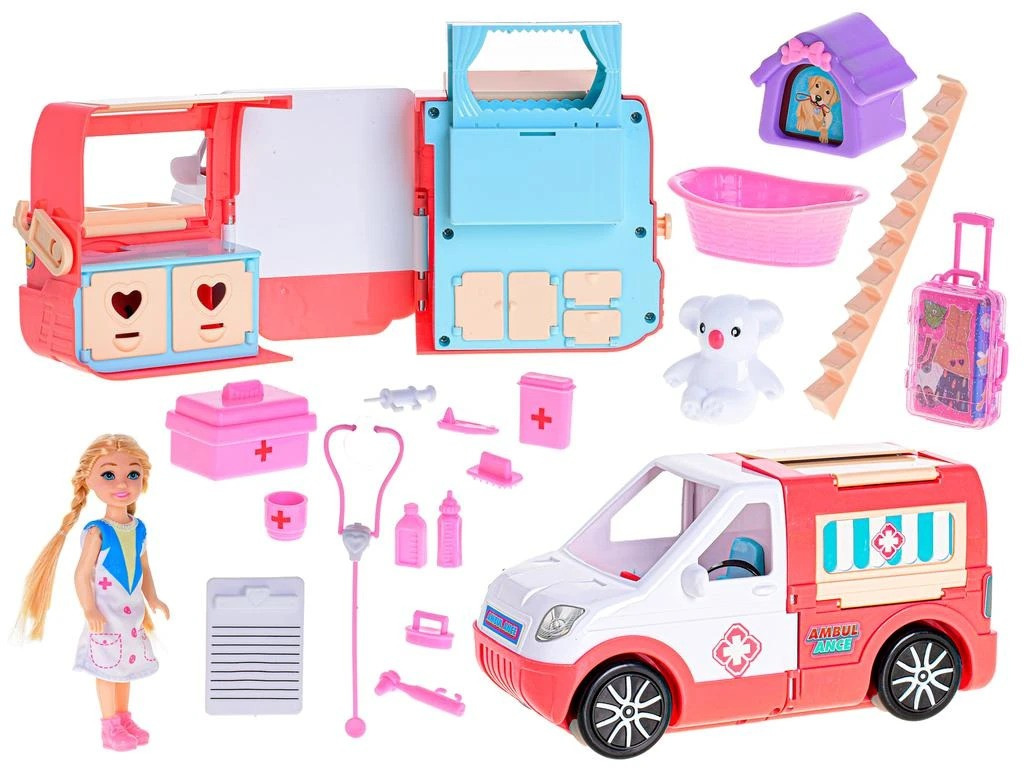 Pojazdná detská ambulancia s dĺžkou 22 cm obsahuje bábiku veľkú 14 cm, zdravotnícke pomôcky, kufrík, zvieratko, búdu a ďalšie doplnky pre ešte realistickejšiu hru na záchranárku. Ideálny darček pre malé dievčatá, ktoré milujú starostlivosť o pacientov a dobrodružné záchranné misie.