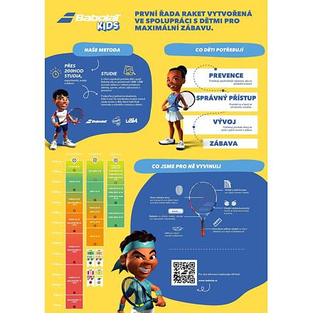 Detská raketa Babolat B Fly 25 je vhodná pre začínajúce hráčky s výškou postavy 135 - 145 cm. Ľahká alumíniová konštrukcia umožňuje ľahkú hrateľnosť rakety. Raketa využíva dva prvky pre výučbu: Learning tool 01 - memo grip - učí dieťa držať raketu na konci rukoväte; Learning tool 02 - right attitude - učí držať raketu v správnej polohe. Súčasťou rakety je aj obal s popruhom na pohodlné nosenie. Pre kvalitný tréning použite aj tréningové loptičky Orange. Parametre: