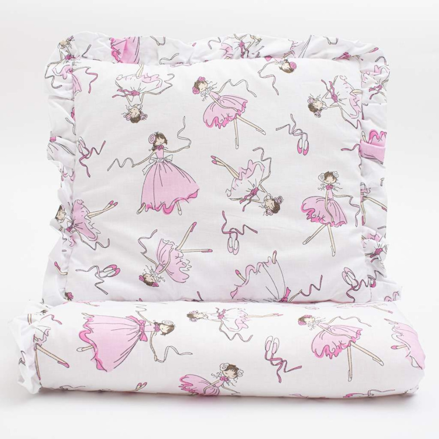 Nádherný bavlnený set do kočíka New Baby Ballerina Bella. Set obsahuje vankúšik a perinku s volánikom a potlačou rozprávkovej tancujúcej baletky. Všetko je vyplnené antialergickým vláknom. Set je ušitý z vysoko kvalitnej bavlny. Bavlnený set luxusne a jemne pohladí a zahreje pokožku vášho bábätka. Rozmery: vankúš: cca 32x25 cm, perinka: cca 82x68 cm. Zloženie: povlak 100% bavlna, výplň 100% polyester.