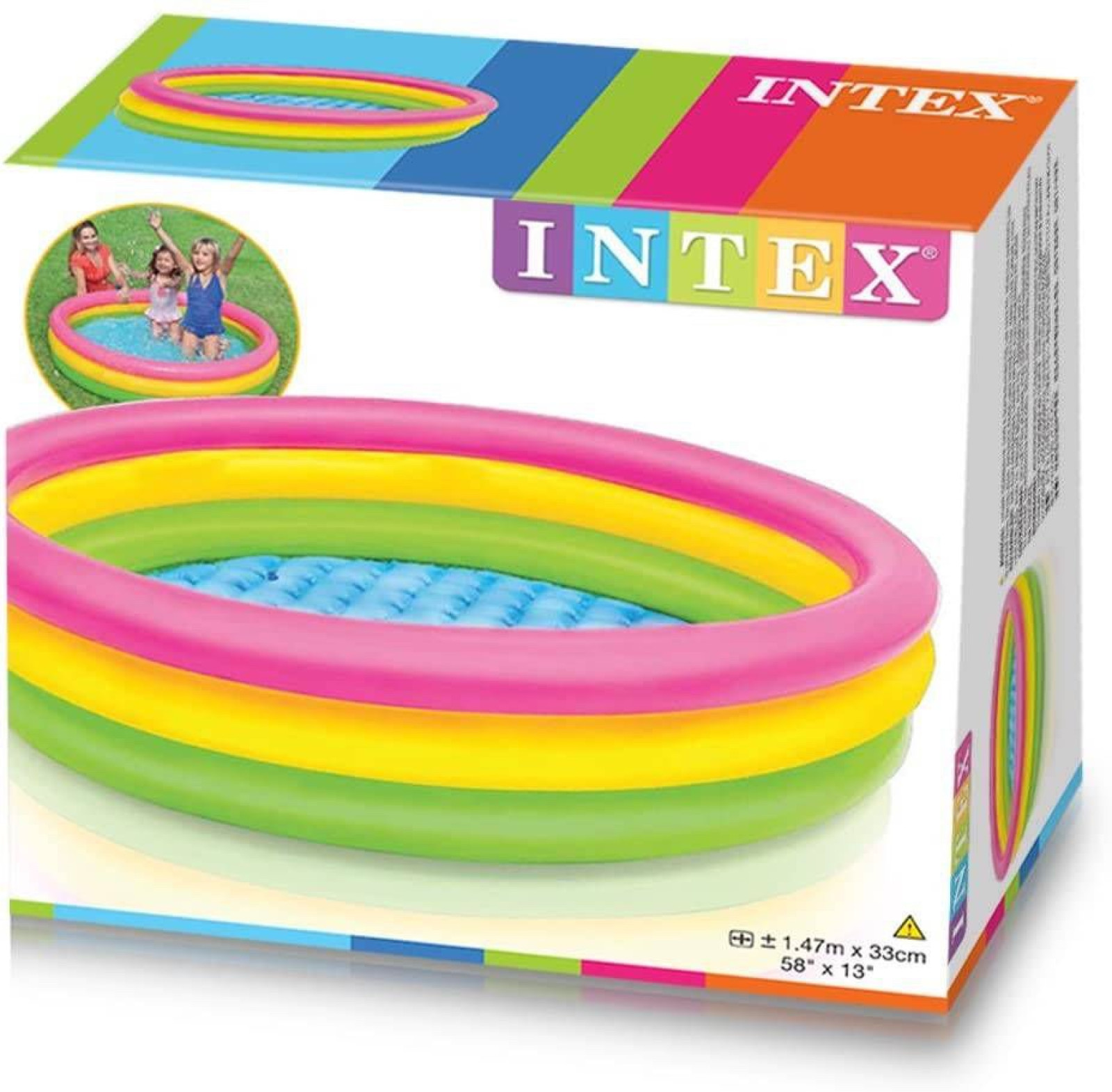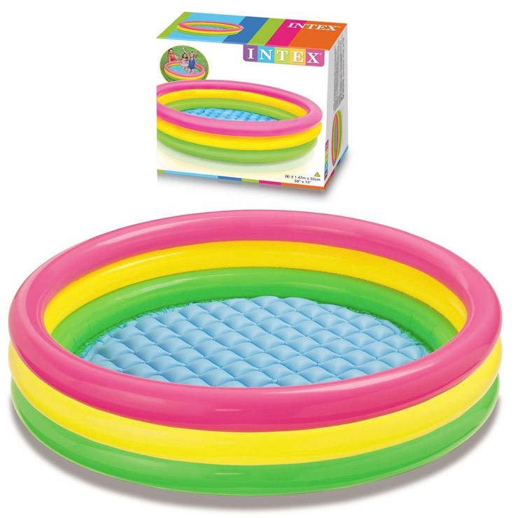 Nafukovací bazén, priemer 147 x 33 cm, vhodný na mäkký trávnatý povrch. Deti v ňom nikdy nenechávajte bez dohľadu.