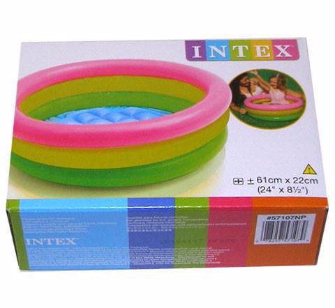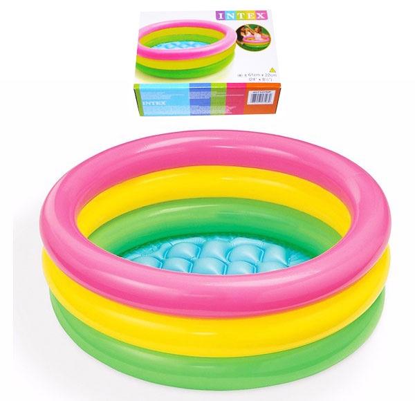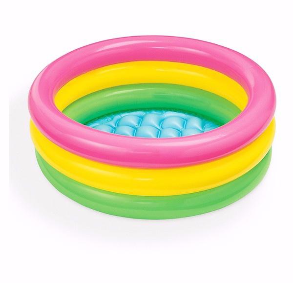 Bazén trojfarebný s priemerom 61 cm a výškou 22cm s tromi komorami, vhodný na mäkký trávnatý povrch. Deti v ňom nikdy nenechávajte bez dohľadu.