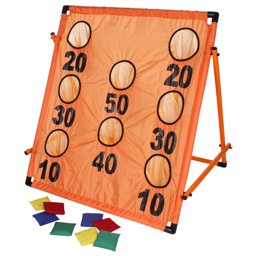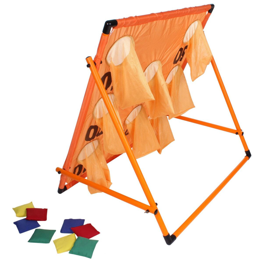 Merco Bean Target je zábavná hra pre celú rodinu založená na podobnom princípe ako populárny americký Cornhole. Celá sada obsahuje skladací terč vyrobený z polyesteru a ľahkej PVC konštrukcie a bavlnenými vreckami naplnené fazuľkami či gumovými guličkami. Hru môžete hrať sami a trénovať tak svoju presnosť spodného hodu, alebo hrajte s priateľmi a vytvorte si poriadnu súťaž o to, kto získa najviac bodov. Terč má po jednoduchom zložení rozmery približne 90 x 93 x 72 cm a hmotnosť necelých 1,5 kg. Vďaka tomu ho jednoducho kamkoľvek ponesiete. Pokiaľ hľadáte novú hru do školy, pre detské krúžky alebo svoju rodinu, Bean Target je to pravé! Upozornenie: Nie je vhodné pre deti mladšie ako 3 roky. Vždy hádžte bean bag spodkom na terč a nie plnou silou horným švihom, inak časom hrozí poškodenie terča. - sada: 1x terč + 4 páry bean bag sáčkov