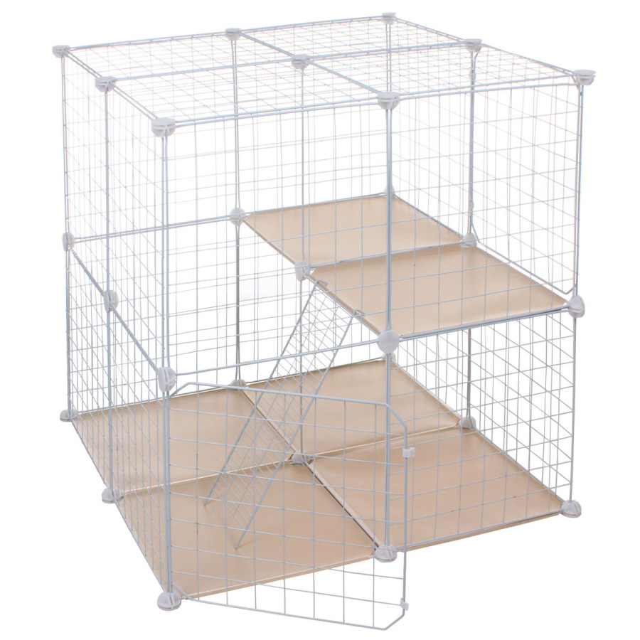 Ohrádka Merco Bella poskytuje vašim menším domácim zvieratám prehľadný a dobre štruktúrovaný priestor, kde môžu pohodlne odpočívať a aktívne sa pohybovať. Vďaka dvojposchodovej konštrukcii, rampe a vstupným dvierkam má váš domáci miláčik viac priestoru a môže prirodzene využívať výšku a štruktúru ohrádky. Celý výbeh je určený na použitie v interiéri a je zostavený v konfigurácii zobrazenom na fotografii, t. j. s otvorenou spodnou časťou, rampou a horným poschodím. Konštrukcia sa skladá z bielych lakovaných mriežkových panelov, ktoré sa ľahko spájajú pomocou pevných plastových spojok. To umožňuje pevnú montáž bez použitia náradia. Podlaha a horná úroveň sú vyrobené z panelov vyplnených plastovou fóliou, ktoré sa ľahko udržiavajú. Dvierka v spodnej a hornej časti ohrady umožňujú ľahký prístup k vášmu domácemu maznáčikovi. Poznámka k veľkosti ok v paneloch klietky: