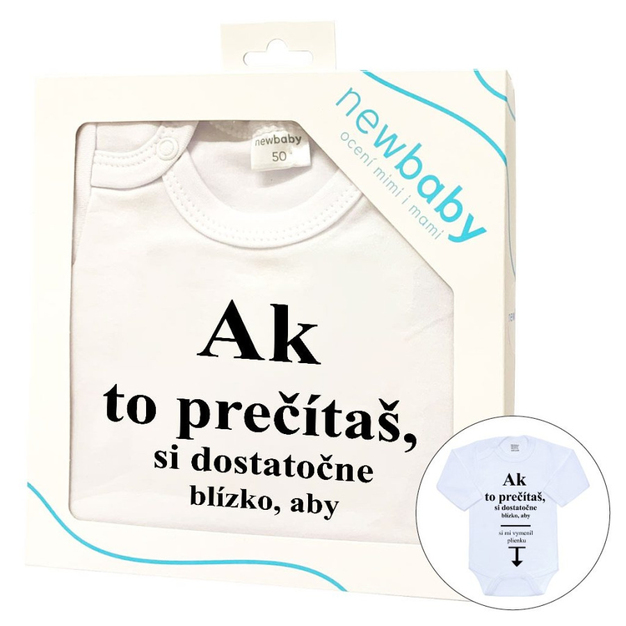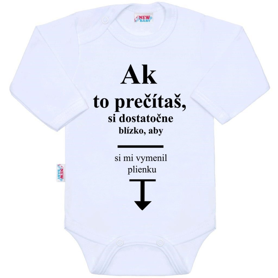 Originálne bavlnené dojčenské body s dlhým rukávom New Baby, s vtipným nápisom Ak to prečítaš, si dostatočne blízko, aby si mi vymenil plienku. Farby použité k potlači sú certifikované a vhodné pre bábätká. Je vyrobené z príjemného a kvalitného materiálu, v ktorom sa bude Vaše bábätko cítiť príjemne. Body má zapínanie na cvočky na ramienku a medzi nožičkami, čo uľahčuje obliekanie a prebaľovanie. Doprajte Vášmu bábätku vyniknúť v originálnom body. Zloženie: 100% bavlna. Rozmery: obvod okolo hrudníka cca 34 cm, dĺžka rukáva cca 16 cm, celková dĺžka cca 30 cm.