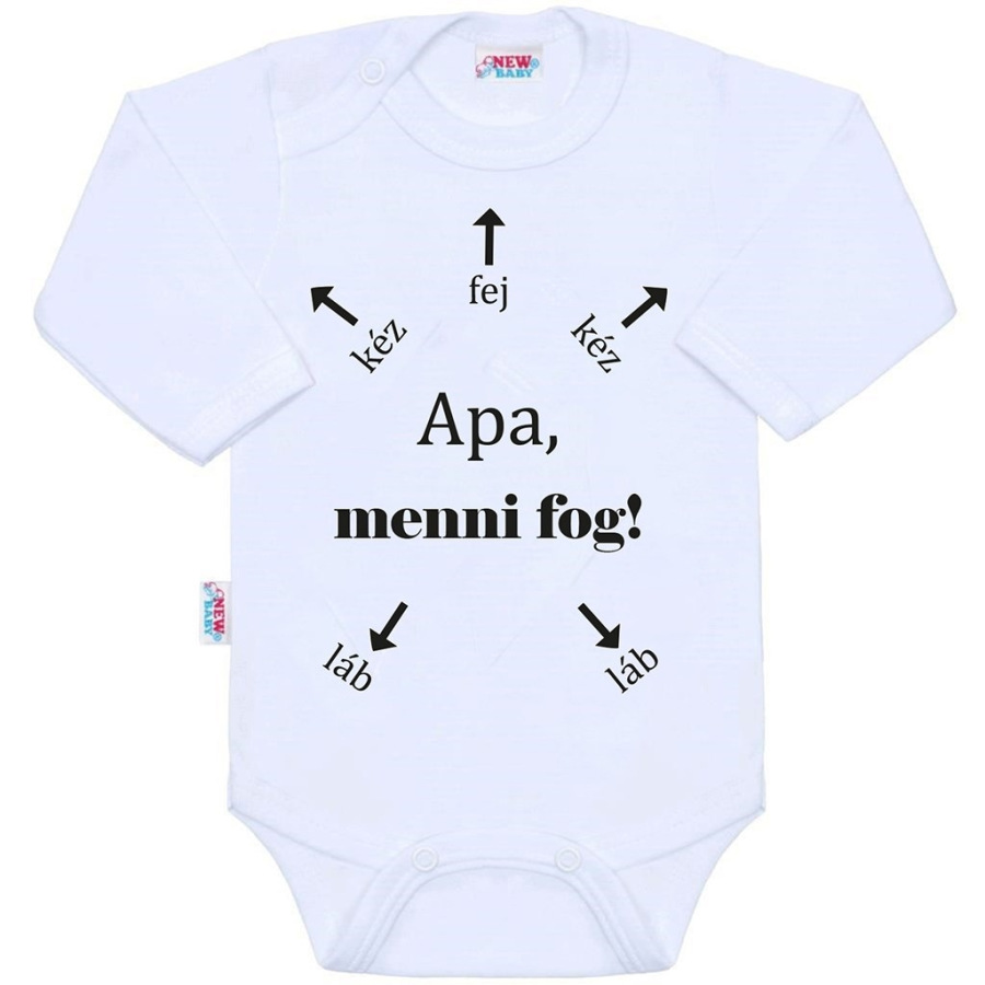 Originálne bavlnené dojčenské body s dlhým rukávom New Baby, s vtipným nápisom Apa, menni fog! Farby použité k potlači sú certifikované a vhodné pre bábätká. Je vyrobené z príjemného a kvalitného materiálu, v ktorom sa bude Vaše bábätko cítiť príjemne. Body má zapínanie na cvočky na ramienku a medzi nožičkami, čo uľahčuje obliekanie a prebaľovanie. Doprajte Vášmu bábätku vyniknúť v originálnom body. Zloženie: 100% bavlna. Rozmery: obvod okolo hrudníka cca 50 cm, dĺžka rukáva cca 26 cm, celková dĺžka cca 42 cm.