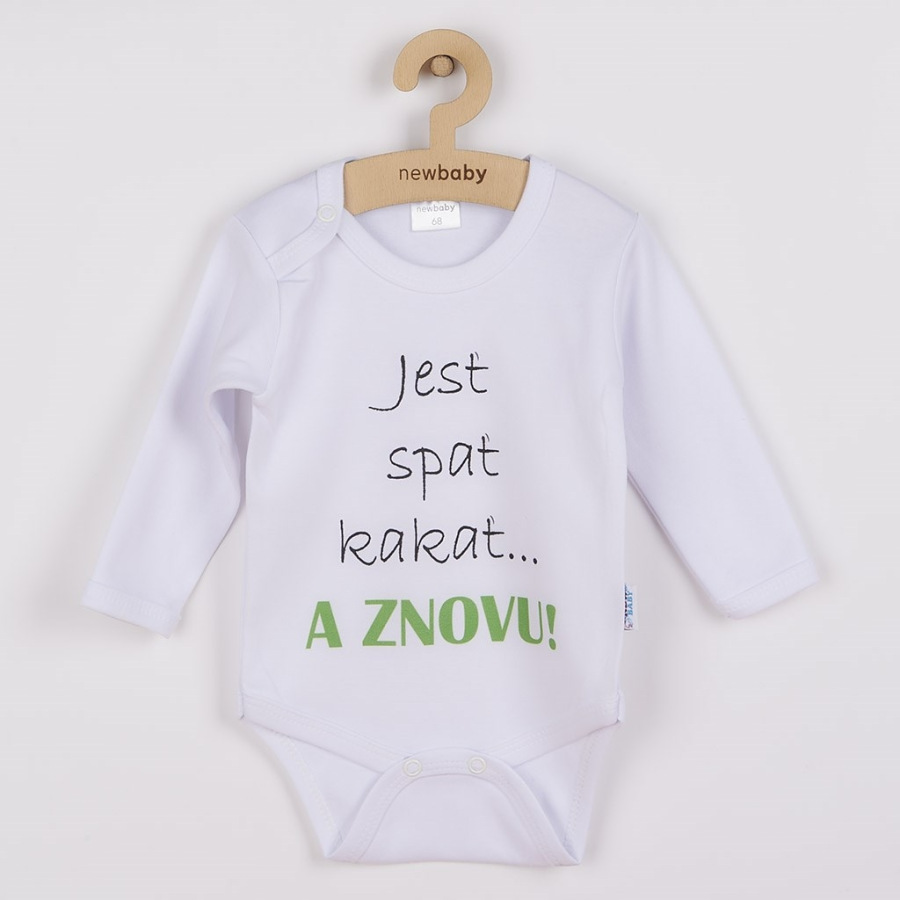 Originálne bavlnené dojčenské body s dlhým rukávom New Baby, s vtipným nápisom Jesť spať kakať...a ZNOVU. Farby použité k potlači sú certifikované a vhodné pre bábätká. Je vyrobené z príjemného a kvalitného materiálu, v ktorom sa bude Vaše bábätko cítiť príjemne. Body má zapínanie na cvočky na ramienku a medzi nožičkami, čo uľahčuje obliekanie a prebaľovanie. Doprajte Vášmu bábätku vyniknúť v originálnom body. Zloženie: 100% bavlna. Rozmery: obvod okolo hrudníka cca 50 cm, dĺžka rukáva cca 26 cm, celková dĺžka cca 42 cm.