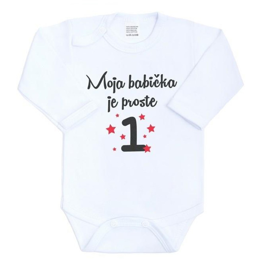 Originálne bavlnené dojčenské body s dlhým rukávom New Baby, s vtipným nápisom Moja babička je proste jednotka. Farby použité k potlači sú certifikované a vhodné pre bábätká. Je vyrobené z príjemného a kvalitného materiálu, v ktorom sa bude Vaše bábätko cítiť príjemne. Body má zapínanie na cvočky na ramienku a medzi nožičkami, čo uľahčuje obliekanie a prebaľovanie. Doprajte Vášmu bábätku vyniknúť v originálnom body. Zloženie: 100% bavlna. Rozmery: obvod okolo hrudníka cca 34 cm, dĺžka rukáva cca 16 cm, celková dĺžka cca 30 cm.