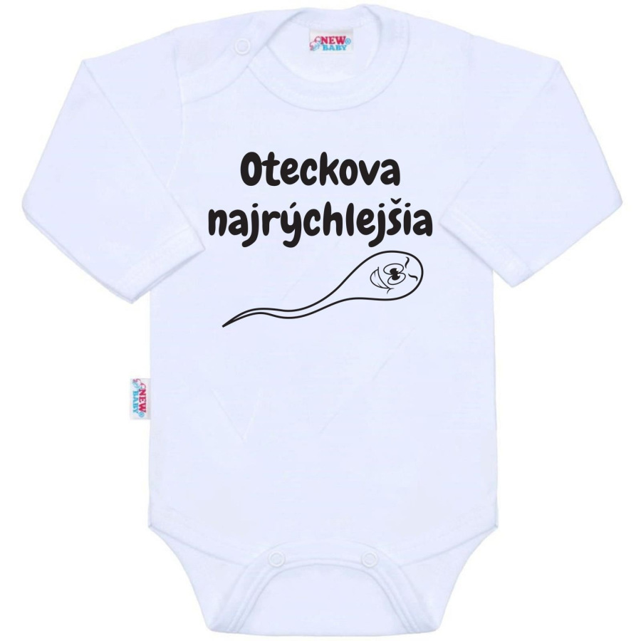 Originálne bavlnené dojčenské body s dlhým rukávom New Baby, s vtipným nápisom OTECKOVA NAJRÝCHLEJŠIA. Farby použité k potlači sú certifikované a vhodné pre bábätká. Je vyrobené z príjemného a kvalitného materiálu, v ktorom sa bude Vaše bábätko cítiť príjemne. Body má zapínanie na cvočky na ramienku a medzi nožičkami, čo uľahčuje obliekanie a prebaľovanie. Doprajte Vášmu bábätku vyniknúť v originálnom body. Zloženie: 100% bavlna. Rozmery: obvod okolo hrudníka cca 50 cm, dĺžka rukáva cca 26 cm, celková dĺžka cca 42 cm.