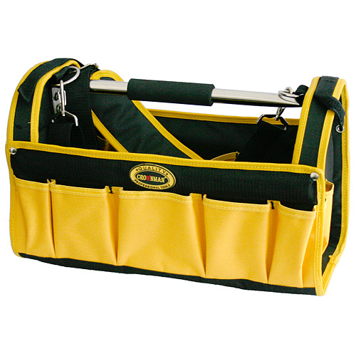 Textilná brašňa na náradie, s kovovou rúčkou a ramenným popruhom.