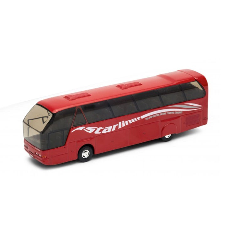Model autobusa výrobcu Welly v mierke 164 s pohonom na spätné natiahnutie a s funkčnými strednými dverami a pekne spracovaným interiérom aj exteriérom.