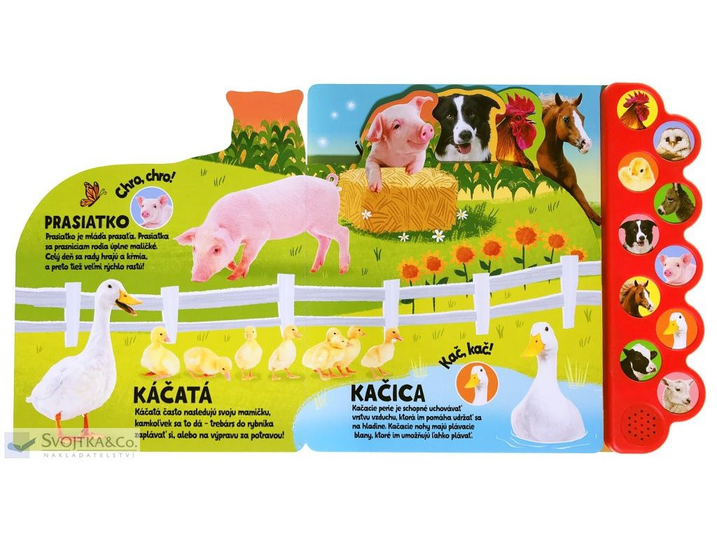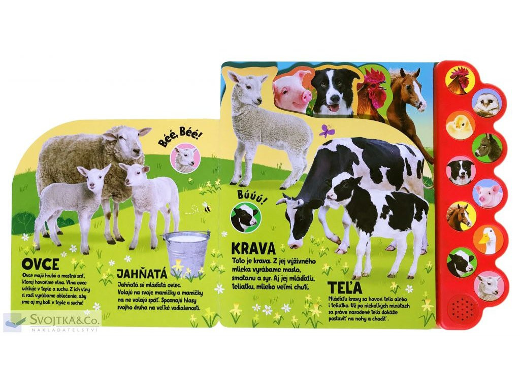 Búú! Chro-chro! Vypočujte si zvieratá z farmy!, po stlačení tlačidla si dieťa vypočuje, aké rôzne zvuky zvieratá vydávajú. Kniha obsahuje tri výmenné batérie. Kniha má 12 strán a jej rozmery sú 28,5x27cm.