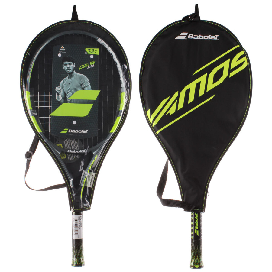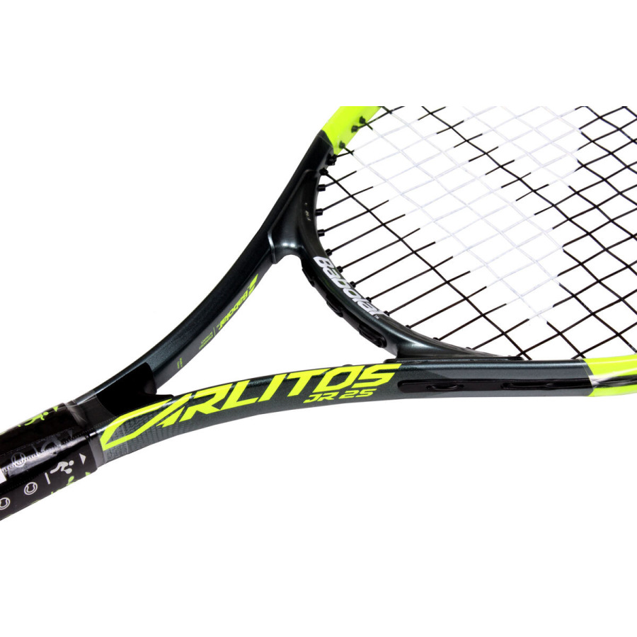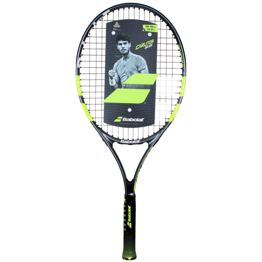 Detská raketa Babolat Carlitos JR 25 inšpirovaná šampiónom Carlosom Alcarazom je vhodná pre začínajúcich hráčov s výškou postavy 135 - 145 cm. Ľahká alumíniová konštrukcia umožňuje ľahkú hrateľnosť rakety. Raketa využíva dva prvky pre výučbu: Learning tool 01 - memo grip - učí dieťa držať raketu na konci rukoväte; Learning tool 02 - right attitude - učí držať raketu v správnej polohe.Súčasťou rakety je aj obal s popruhom na pohodlné nosenie. - dĺžka: 25 in / 635 mm