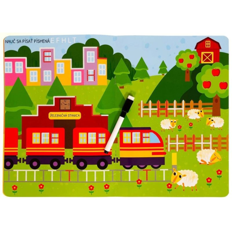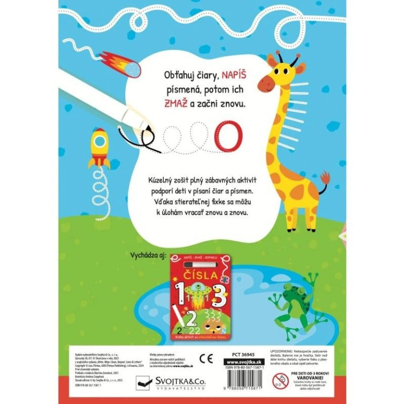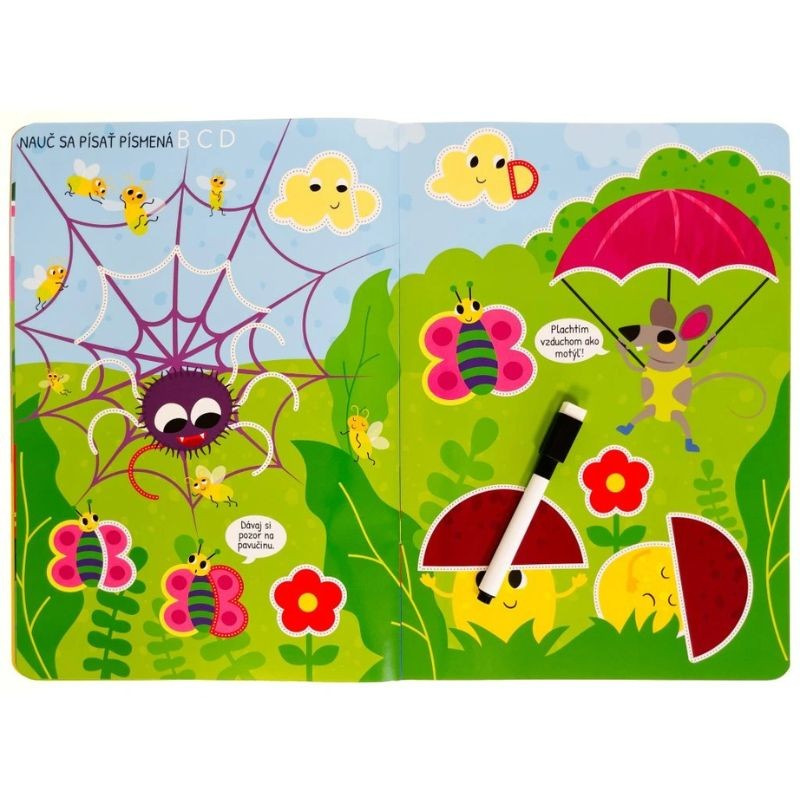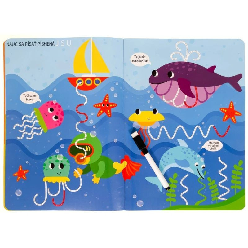 Knižka s pevnými lesklými stránkami a stierateľnou fixkou pripraví pomocou rôznych cvičení vášho predškoláka na písanie písmen. Deti obťahujú čiary, píšu písmená, potom všetko zmažú a začnú znova. Hravé obrázky nabádajú na obťahovanie rovných, kľukatých aj zakrivených čiar, ktoré v sebe nápadne ukrývajú aj písmená. Zošit je vhodný pre deti, ktoré sa učia prvé ťahy aj detailnejšie linky a prvé písmená. Nemusia sa báť chýb — stačí zmazať a skúsiť znova.