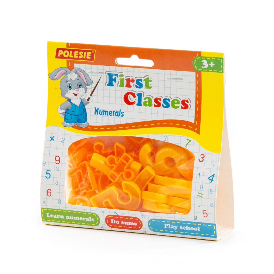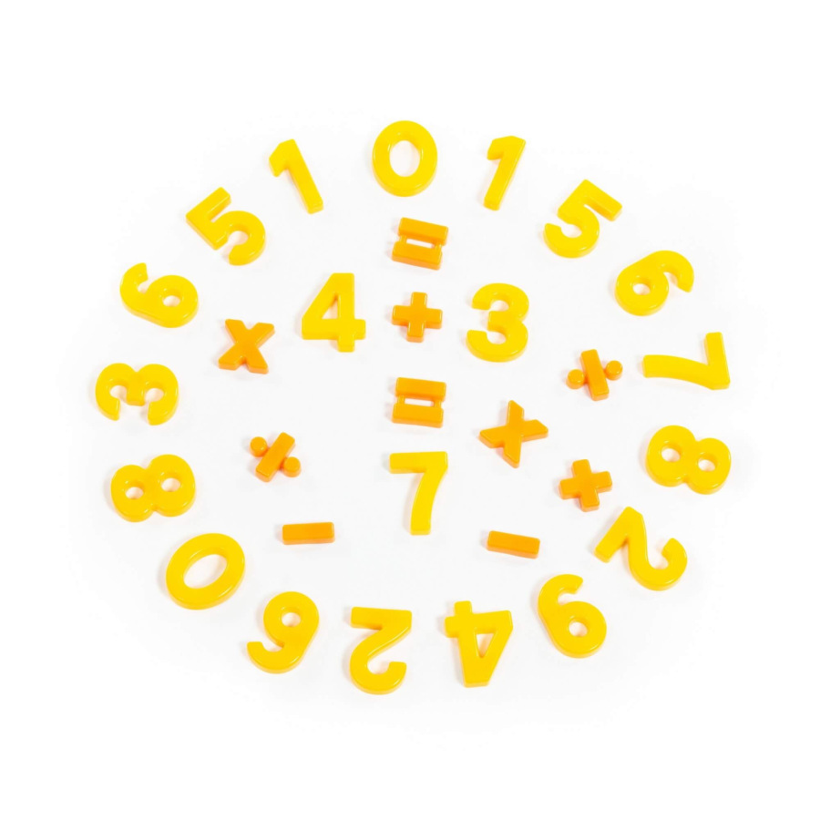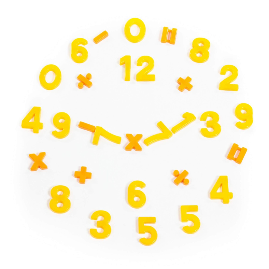 Pomocník pre malých školákov. Sada obsahuje 20 číslic a 10 matematických symbolov. Čísla sú zvýraznené žltou farbou a matematické symboly oranžovou farbou.