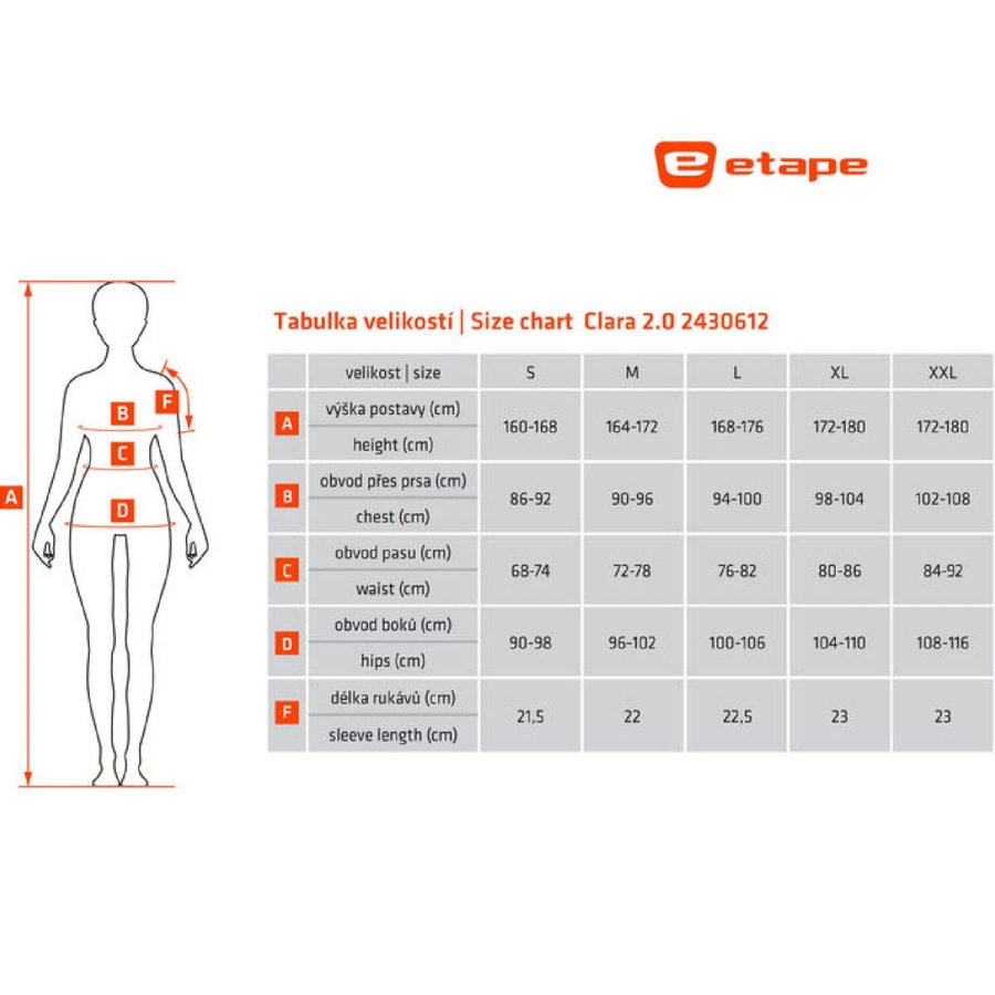 Dámsky cyklistický dres Etape Clara 2.0 ocení každá cyklistka, či už na bicykli jazdí pravidelne alebo rekreačne. Dres s krátkym rukávom je vyrobený z elastického materiálu SuperDryntex - funkčný elastický materiál z polyesterových mikrovlákien, ktorý veľmi rýchlo schne, odvádza pot a vlhkosť od pokožky. Dres ďalej ponúka krátky predný zips a 3 zadné vrecká na uloženie drobností. Vďaka použitým reflexným prvkom budete na ceste vždy dobre videná. Veľkostná tabuľka v obrázkoch. Uvedené hodnoty sú iba orientačné a vhodná veľkosť sa môže líšiť podľa konkrétneho typu postavy.
