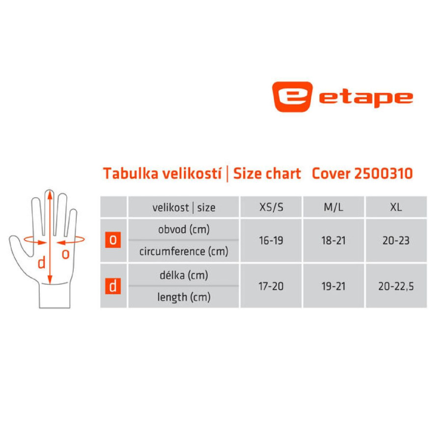 Rukavice Etape Cover sú vhodné na šport aj bežné nosenie pre teplotné rozmedzie -10 °C až 10 °C. Tento model v sebe kombinuje ľahké prstové rukavice a teplé palčiaky. Vďaka technológii SmartTouch je možné ovládať displeje mobilných telefónov, tabletov, MP3 prehrávačov, kamier, fotoaparátov alebo navigácií. Rukavice sú vyrobené z kombinácie SoftShell a ThermoFit materiálu. Softshell je elastický materiál odolný vetru a vode. ThermoFit je elastický materiál s výbornými termoizolačnými vlastnosťami. Uvedené veľkosti sú iba orientačné, vhodná veľkosť sa môže líšiť podľa konkrétnej postavy - rukavice 2v1 - prstové ľahké rukavice a teplé palčiaky v jednom výrobku