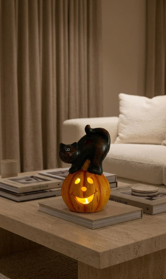 Dekorácia MagicHome Nature, Tekvica LED, mačka, keramika, 22 cm