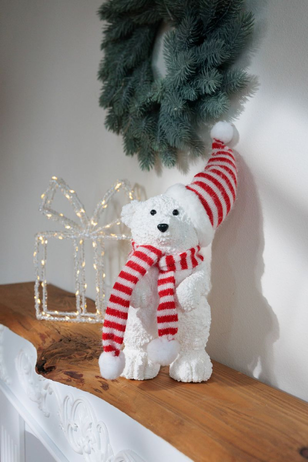 Medveď je univerzálny prvok dekorácie, ktorý môžete umiestniť na poličku, komodu, pod vianočný stromček alebo ako súčasť zimnej aranžmánovej výzdoby. Svojím originálnym spracovaním prinesie do interiéru kúzlo Vianoc.