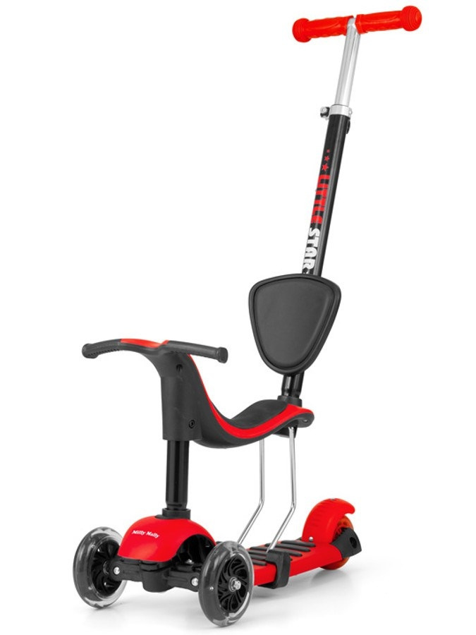 Super štýlová detská kolobežka Milly Mally Little Star. Nie je to len kolobežka, je to tiež odrážadlo pre deti od druhých narodenín, ktoré má sedadlo aj vodiacu tyč pre rodičov. Nosnosť do 20 kg. Sedadlo aj vodiacu tyč možno jednoducho zložiť a z odrážadlá sa razom stane kolobežka s nosnosťou do 50 kg.