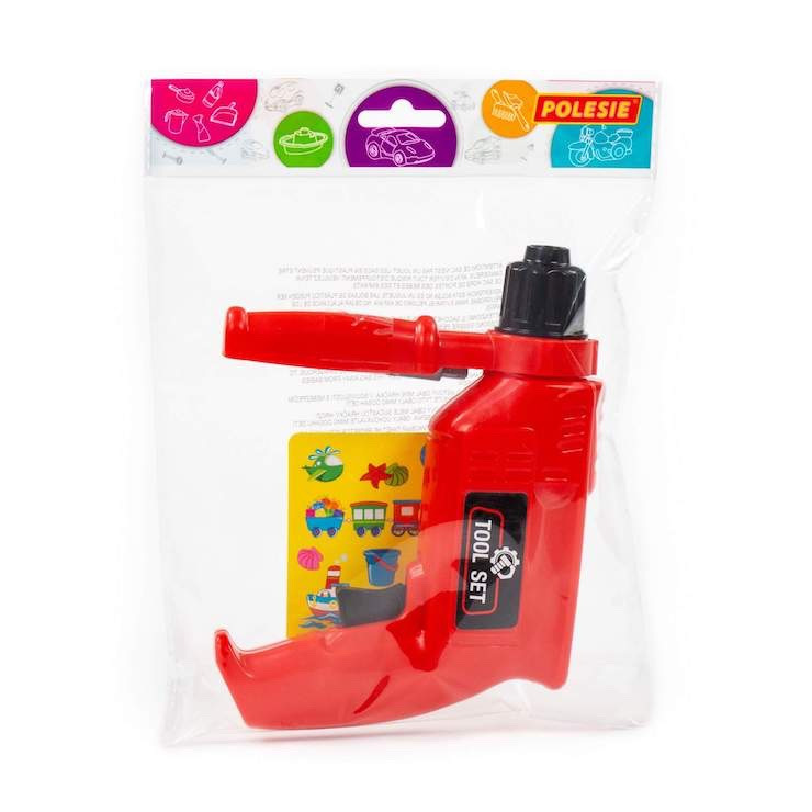 Vŕtačka je vyrobená v jasne červenej farbe, má páku, po stlačení sa vŕtačka začne otáčať.