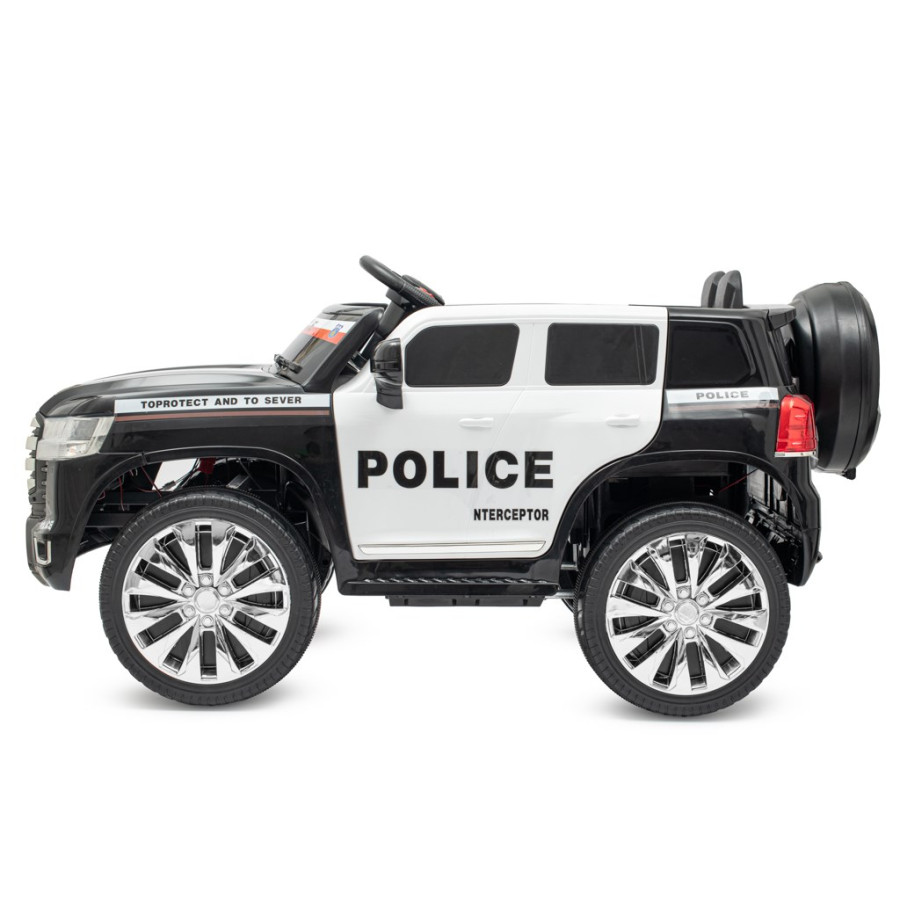 Detské elektrické autíčko Baby Mix Police s pohonom 4x4 a batériou 12V 7Ah ľahko zvláda náročnejší terén a jazdu do kopca. Autíčko je vybavené diaľkovým ovládačom pre rodičov, ktorý umožňuje jazdu dopredu, dozadu, vľavo aj vpravo. Okrem toho má hudobný panel s prednahranými melódiami a pesničkami a možnosťou pripojenia USB. Na palubnej doske vpravo sa nachádza imitácia LCD displeja a tlačidlá pre jazdu a štartovacie tlačidlo.
