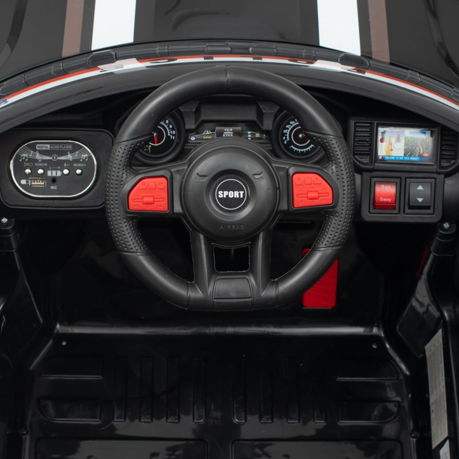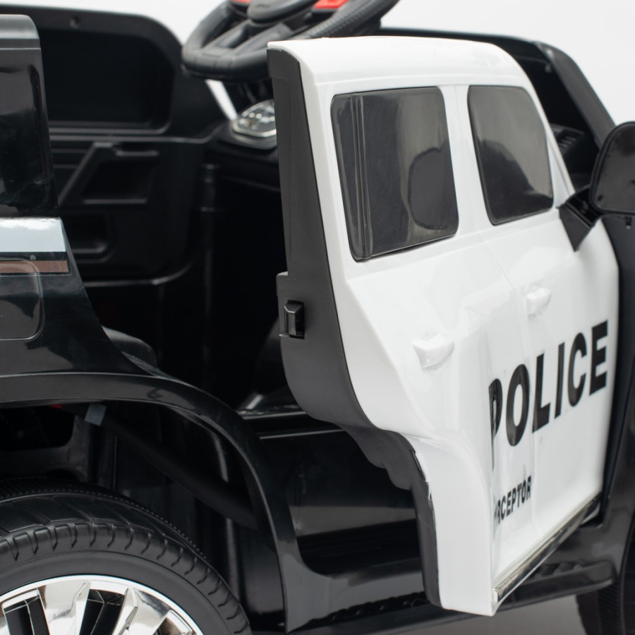 Detské elektrické autíčko Baby Mix Police s pohonom 4x4 a batériou 12V 7Ah ľahko zvláda náročnejší terén a jazdu do kopca. Autíčko je vybavené diaľkovým ovládačom pre rodičov, ktorý umožňuje jazdu dopredu, dozadu, vľavo aj vpravo. Okrem toho má hudobný panel s prednahranými melódiami a pesničkami a možnosťou pripojenia USB. Na palubnej doske vpravo sa nachádza imitácia LCD displeja a tlačidlá pre jazdu a štartovacie tlačidlo.