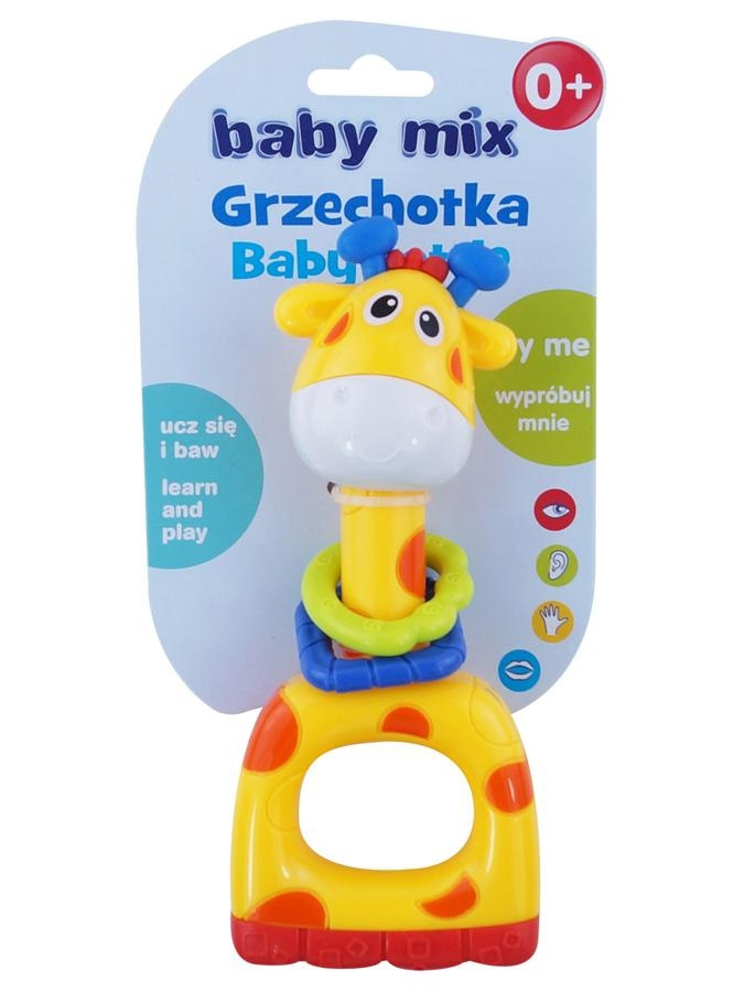 Krásna farebná detská hrkálka Baby Mix v tvare žirafy. Hrkálka je určené deťom od narodenia. Atraktívne tvary a intenzívne farby zaujmú pozornosť dieťaťa. Pohyblivé diely zoznamujú dieťa so svetom zvukov a farieb. Hrkálka je vyrobená z bezpečných materiálov.