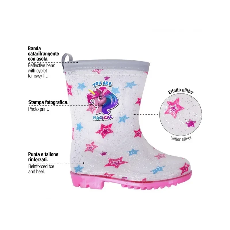 Tieto detské gumáky Perletti Cool Kids Unicorn poskytnú deťom komfort a bezpečie aj počas daždivého počasia. Vďaka pevnej protišmykovej podrážke zvládnu aj mokré a šmykľavé povrchy.