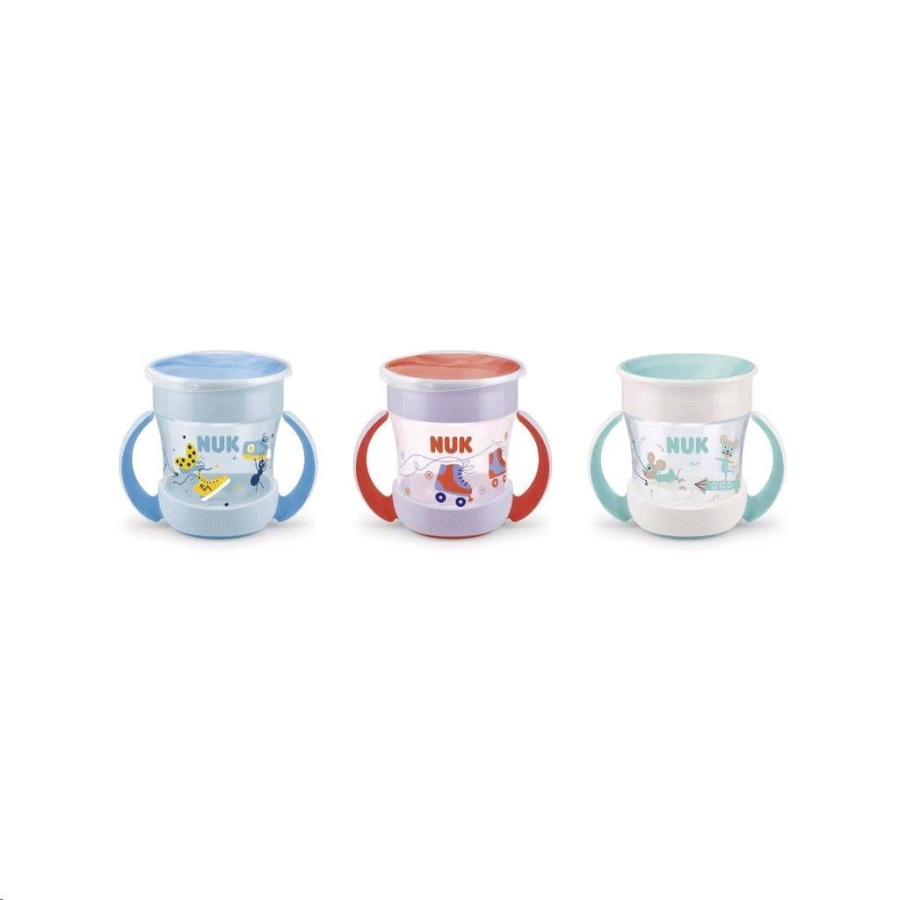 Detský hrnček Mini Magic NUK 360 ° s viečkom. Revolučný uzáver umožňuje piť bez náustku či slamky z každej strany, vďaka čomu sa dieťa učí samo piť ako z normálneho hrnčeka. Neobsahuje BPA. Charakteristika: