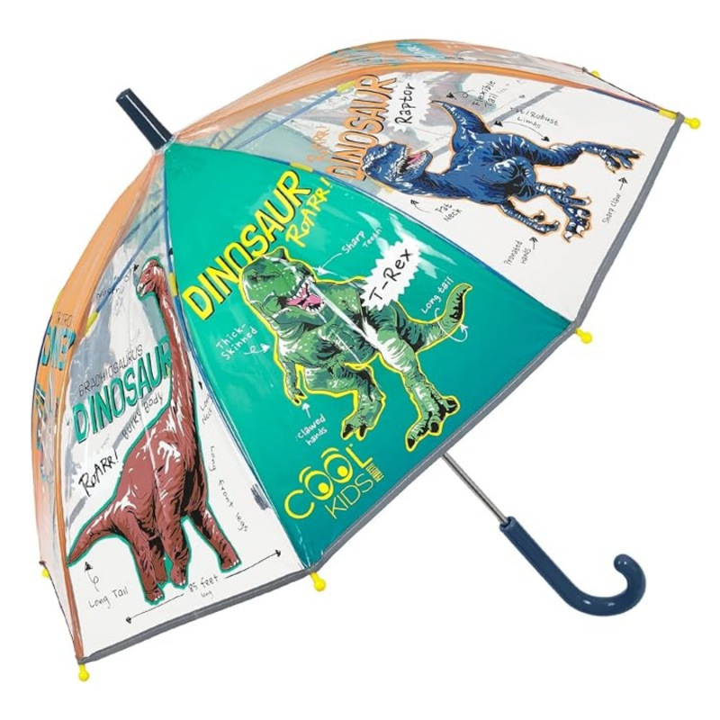 Detský dáždnik Perletti Cool Kids „Dinosaur“ 🌧️🦖 je ideálnym spoločníkom na daždivé dni plné objavovania. Transparentná kupola s veselými dinosaurovými kresbami im zabezpečí dobrý výhľad a radosť z každého kroku. Reflexné pásiky okolo špice a spodného okraja zaistia, že budú viditeľní aj počas šera 🚸. Oceľové rebrá s bezpečnostnými zaoblenými hrotmi chránia pred poranením, zatiaľ čo ergonomická „J“ rukoväť z kvalitného plastu padne do malých rúčok ako uliata 🤚. S hmotnosťou len 250 g a odolným polyesterom je dáždnik ľahký na nosenie a zároveň odolný voči vetru aj vode 💧.