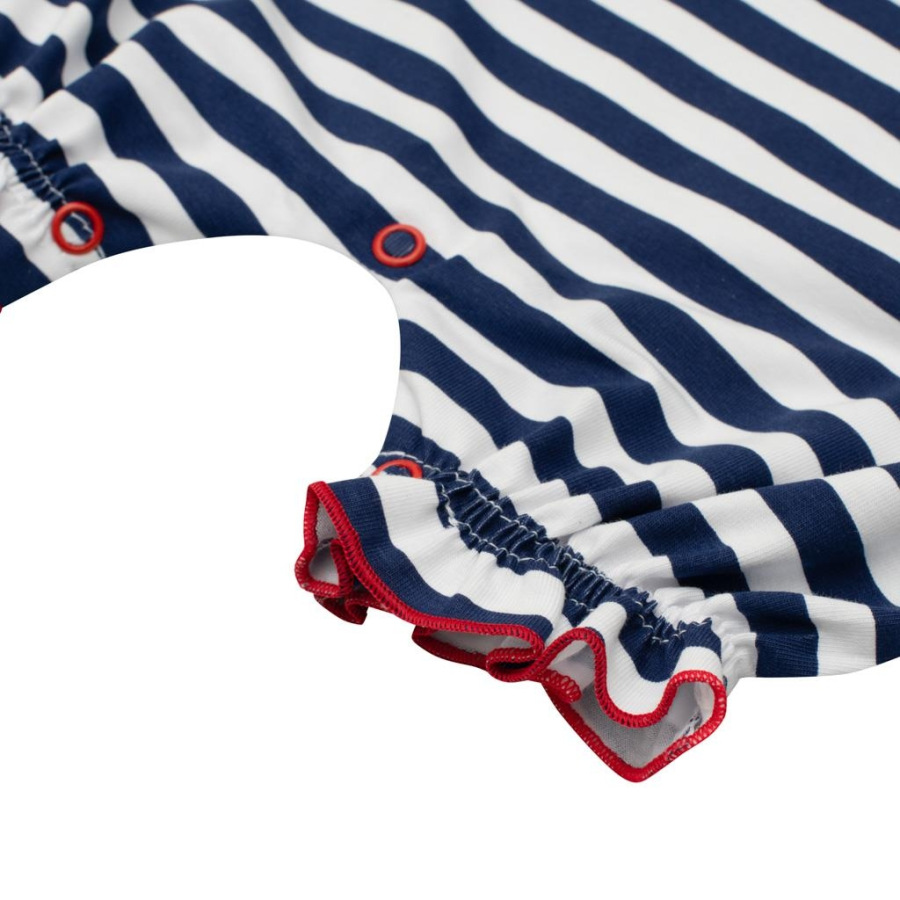 Letný bavlnený overal s krátkym rukávom New Baby Marine. Overal s krátkym volánikovým rukávom celopotlačený modernými pruhmi s nášivkou kotvy. Nášivka je podlepená látkou proti poškriabaniu. Má praktické zapínanie na cvočky na ramienku a medzi nožičkami, čo uľahčí obliekanie a prebaľovanie. Super štýlový letný motív rozžiari každé bábätko. Zloženie: 100% bavlna.