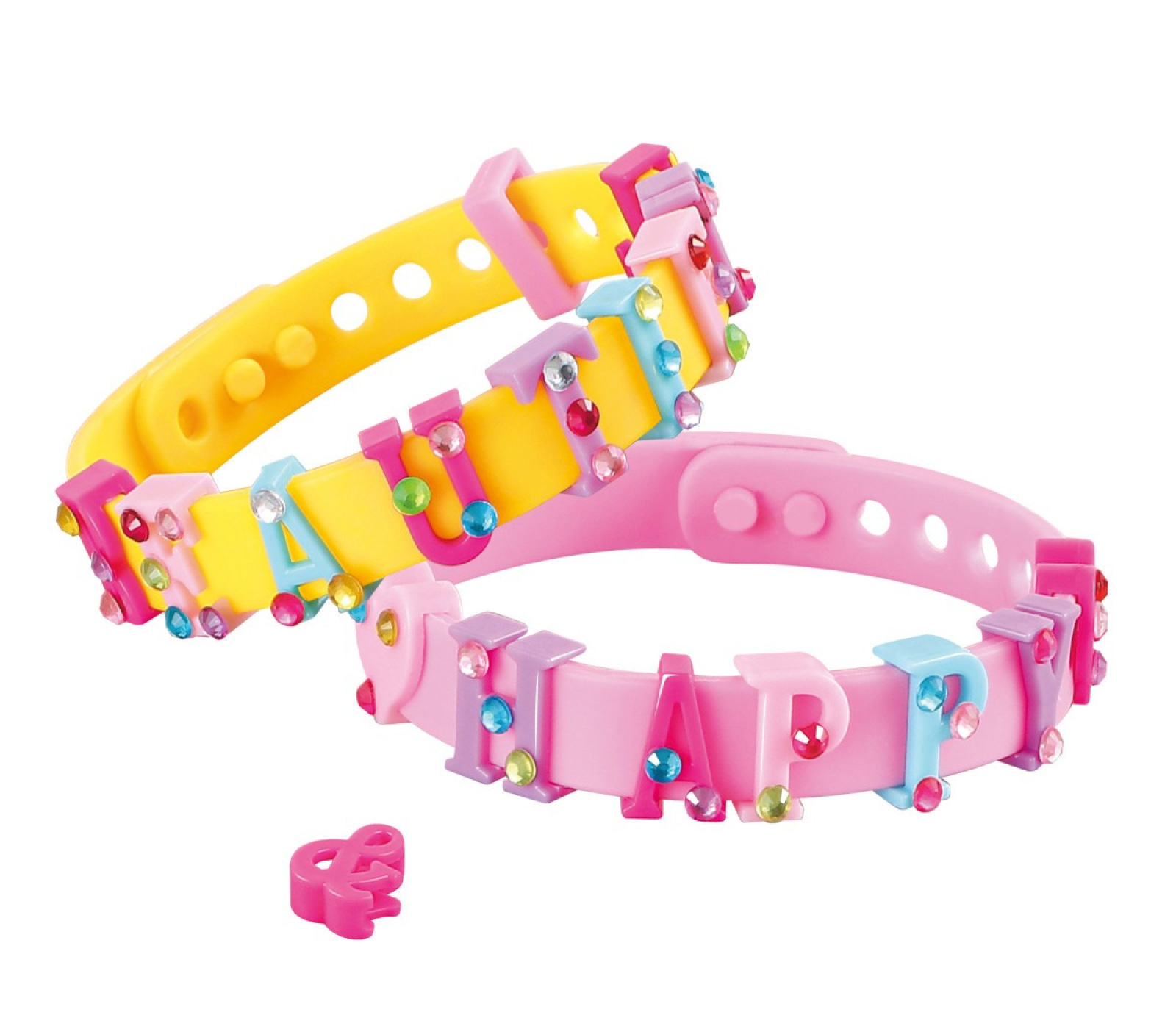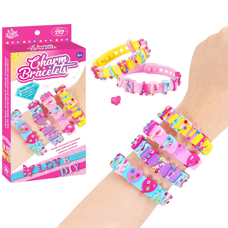 DIY písmenový náramok, ukáž svoj štýl a vyrob si vlastný náramok. Balenie obsahuje štyri náramky, farebné písmenká a nalepovacie farebné kamienky. Cena je za kus. Vhodné pre deti vo veku 3+ rokov.