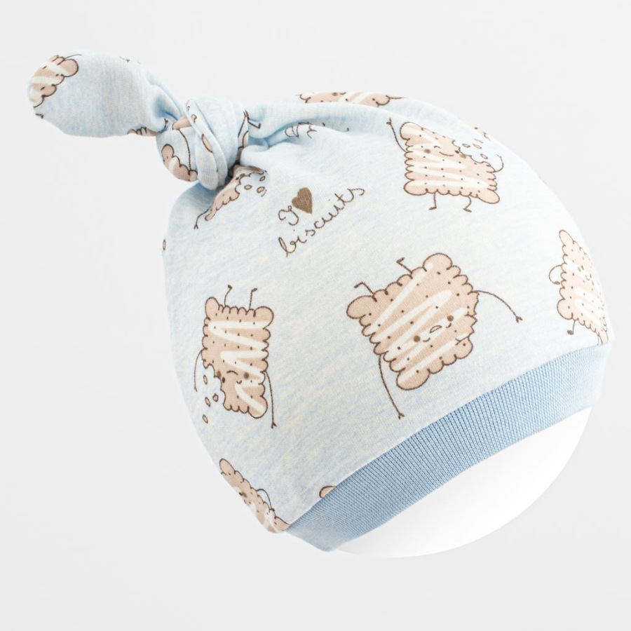 Dojčenská čiapočka New Baby Biscuits s roztomilým uzlíkom v hornej časti. Čiapočka je celopotlačená obrázkami sušienok. Skvelá vychytávka, ktorú možno využiť ako krásny doplnok, alebo ako praktický kúsok oblečenia. Lem je široký a netlačí na hlavičku bábätka. Príjemná na dotyk a krásne sedí na hlavičke. Fantázia v obliekaní nepozná hraníc a záleží len na vás, ako čiapočku doladíte s oblečením kolekcie Biscuits. Zloženie: 100% bavlna.