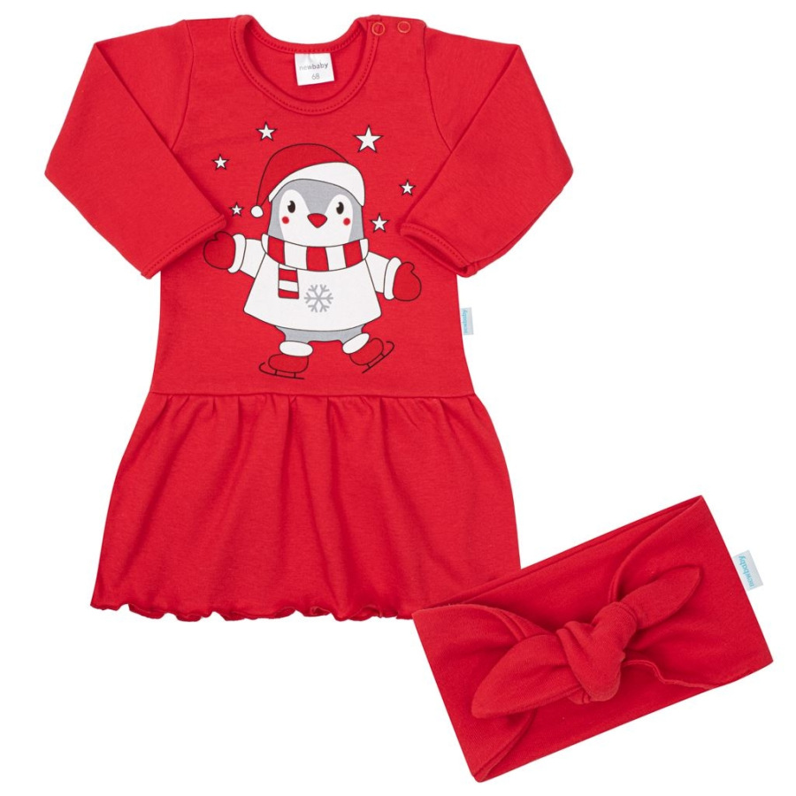 Krásne bavlnené dojčenské šatôčky s čelenkou New Baby Winter Penguin pre všetky malé parádnice. Šatičky s dlhým rukávom v krásnej červenej farbe sú zdobené roztomilým a veselým