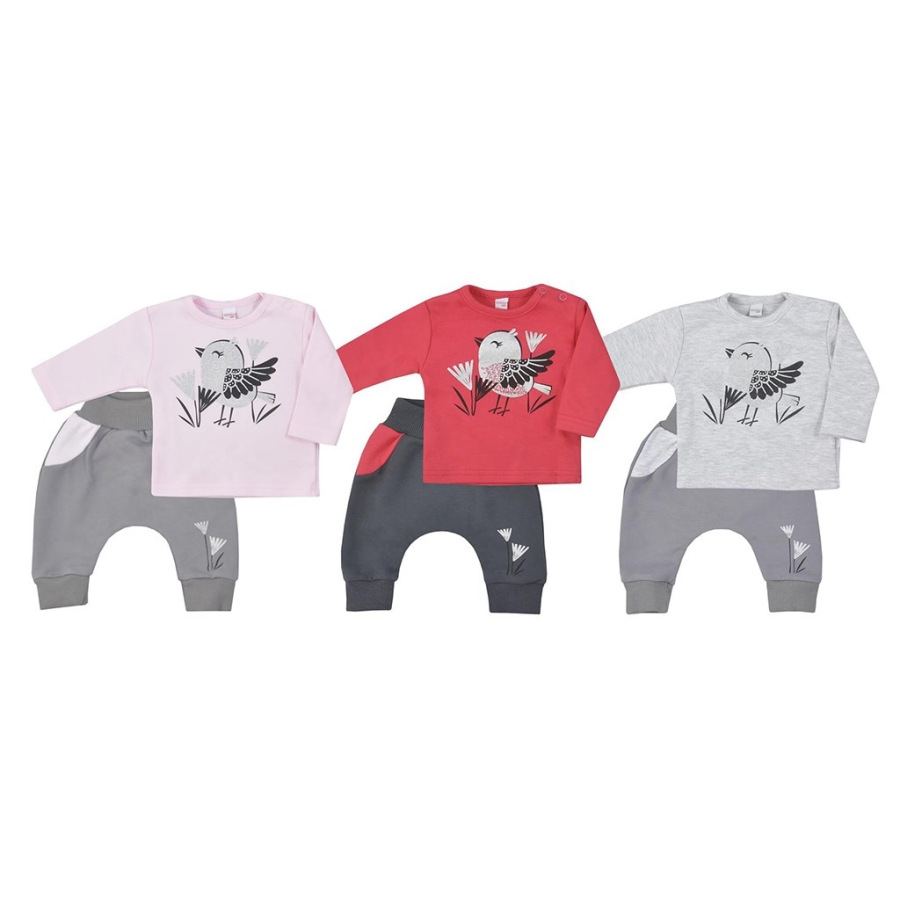 2-dielna bavlnená súprava Koala Birdy. Súčasťou súpravičky sú tepláčky a tričko. Tepláčky majú moderný strih so zníženým sedom, ktorý im dodáva ten správny šmrc, sú zdobené obrázkom a ukončené širokým pružným lemom. Tričko je zdobené roztomilým obrázkom. Praktické zapínanie na cvočky na ramienku veľmi uľahčí obliekanie. Materiál: 100% bavlna.