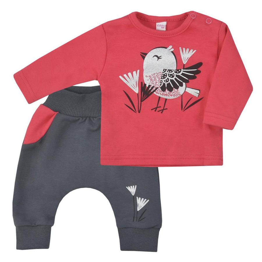 2-dielna bavlnená súprava Koala Birdy. Súčasťou súpravičky sú tepláčky a tričko. Tepláčky majú moderný strih so zníženým sedom, ktorý im dodáva ten správny šmrc, sú zdobené obrázkom a ukončené širokým pružným lemom. Tričko je zdobené roztomilým obrázkom. Praktické zapínanie na cvočky na ramienku veľmi uľahčí obliekanie. Materiál: 100% bavlna.