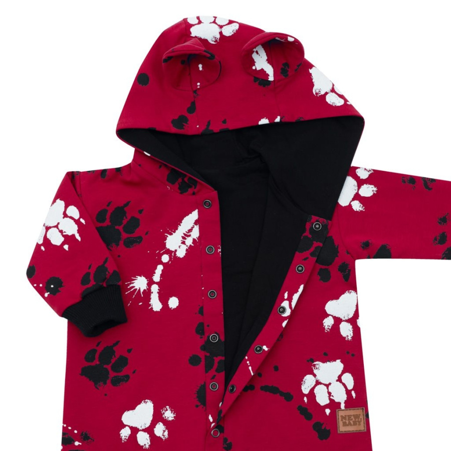 Nápaditý bavlnený dojčenský overal New Baby Paw. Overal je celopotlačený detským vzorom. Je vyrobený z kvalitného bavlneného materiálu s elastanom a bavlnenou podšívkou. Materiál je hladký a príjemný na dotyk. Praktické zapínanie na cvočky po celej dĺžke veľmi uľahčí obliekanie a prebaľovanie. Overal má praktickú kapucňu s uškami, širšie pružné lemy na rukách a nohavičkách a celá vnútorná strana je zateplená bavlnenou podšívkou, ktorá zvyšuje komfort nosenia. Bábätko sa bude cítiť v overale veľmi pohodlne a príjemne. Zloženie: 95% bavlna, 5% elastan, podšívka-95% bavlna, 5% elastan. Vhodné na jar a na jeseň.