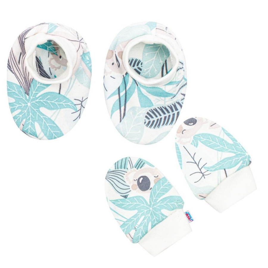 Krásny a praktický bavlnený set New Baby Lovely. Set sa skladá z capačiek a rukavičiek. Capačky a rukavičky sú zdobené roztomilým vzorom a majú sťahovacie manžetky. Zloženie: 100% bavlna.