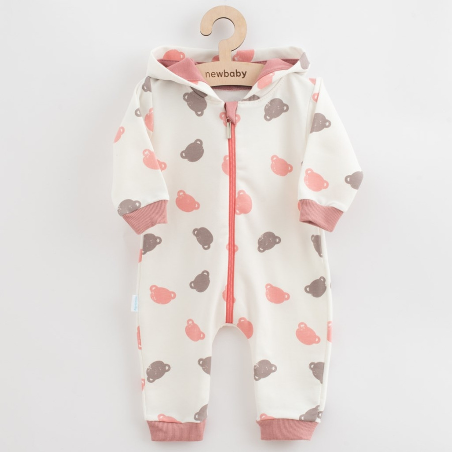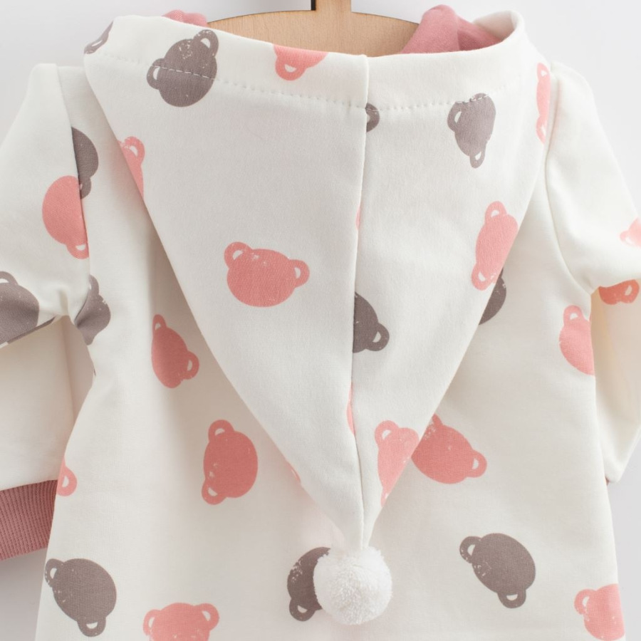 Roztomilý a praktický overal s kapucňou New Baby Little One. Overal je celopotlačený medvedíkmi, má zapínanie na zips po celej dĺžke a pružné lemy na rukávoch a nohavičkách. Kapucňa je podšitá farebnou podšívkou a je zdobená roztomilým brmbolcom. Overal je vyrobený z pohodlnej teplákoviny. Vhodný na celoročné nosenie. Materiál: 96% bavlna, 4% elastan.
