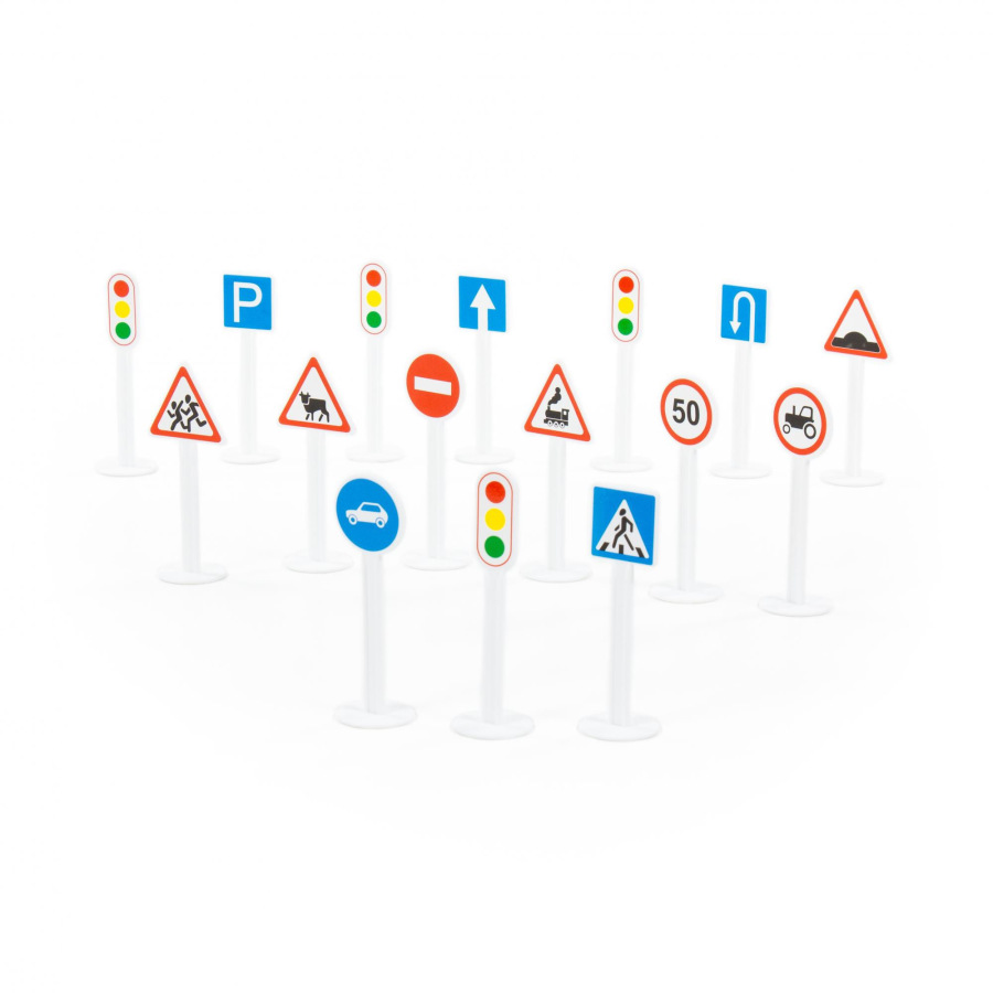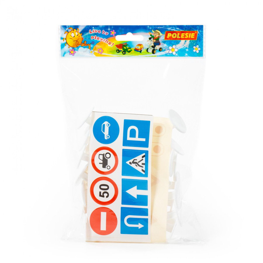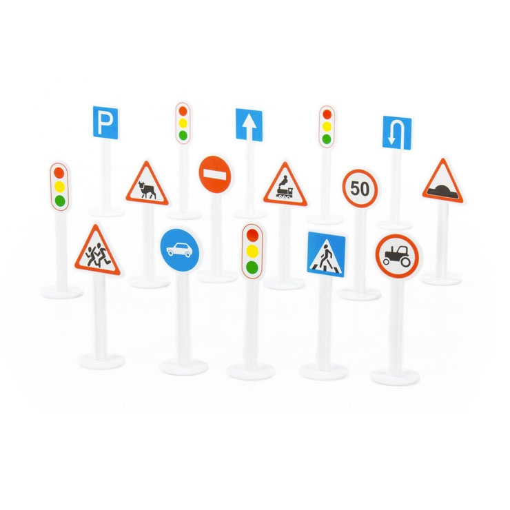 Dopravné značky, v balení je 16 ks značiek 9,5 cm vysokých a nálepky na značky.