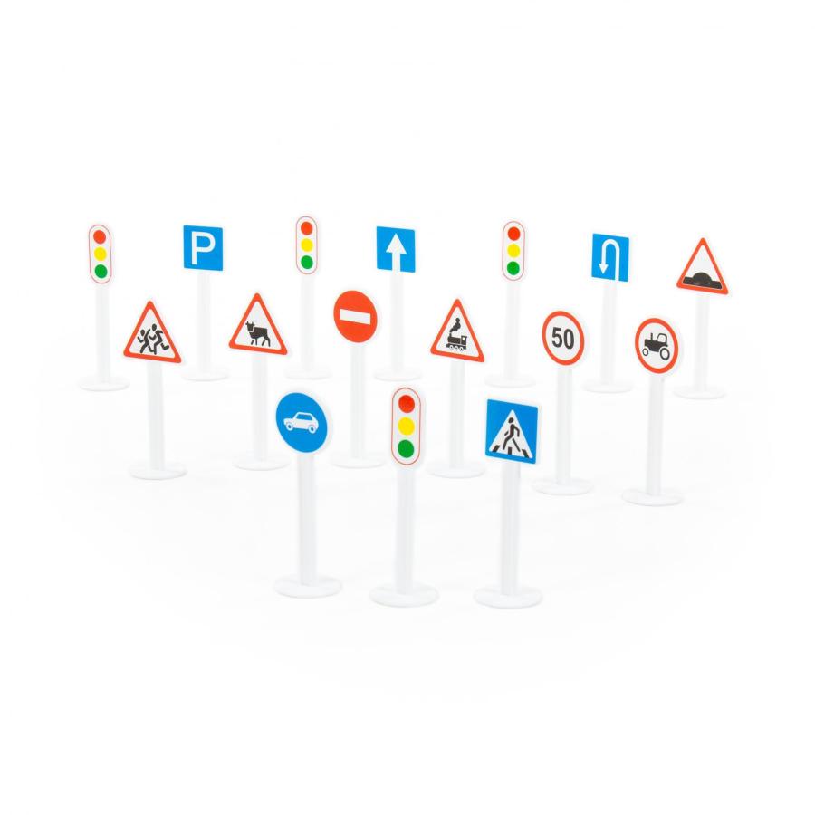 Dopravné značky, v balení je 16 ks značiek 9,5 cm vysokých a nálepky na značky.